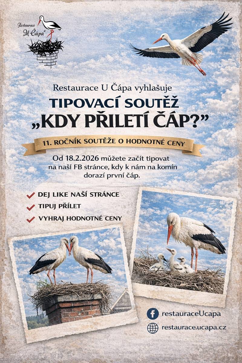 Od 18. 2. 2026 tipujte datum a čas příletu prvního čápa na náš komín. Nejpřesnější tipy získají hodnotné ceny.